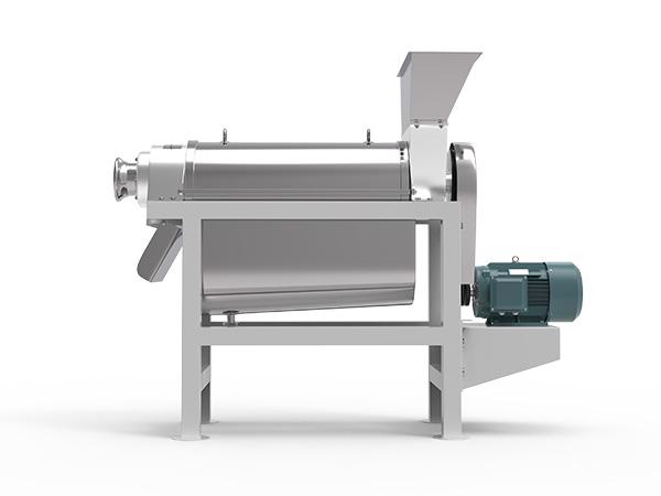 ★ 原料加入進料斗中,在螺旋的推進下受壓,其壓榨的汁液通過過濾網(wǎng)流入底部的盛汁器,而渣則通過螺旋與調(diào)壓頭的錐形部分之間形成的環(huán)狀空隙排出,調(diào)壓頭沿軸向的移動可調(diào)整空隙的大小。用手順時針(從設(shè)備的出渣槽向進料斗端看)轉(zhuǎn)動手輪軸承座時,調(diào)壓頭向左,空隙即縮小,反之則空隙變大。改變孔隙的大小,即調(diào)整排渣的阻力,即可改變出汁率。但如果孔隙過小,在強力擠壓下,部分渣的顆粒會和汁一起通過過濾網(wǎng)被擠出,盡管出汁率增加,但汁的質(zhì)量相對下降,因此孔隙的大小應(yīng)視用戶的具體工藝要求而定。
